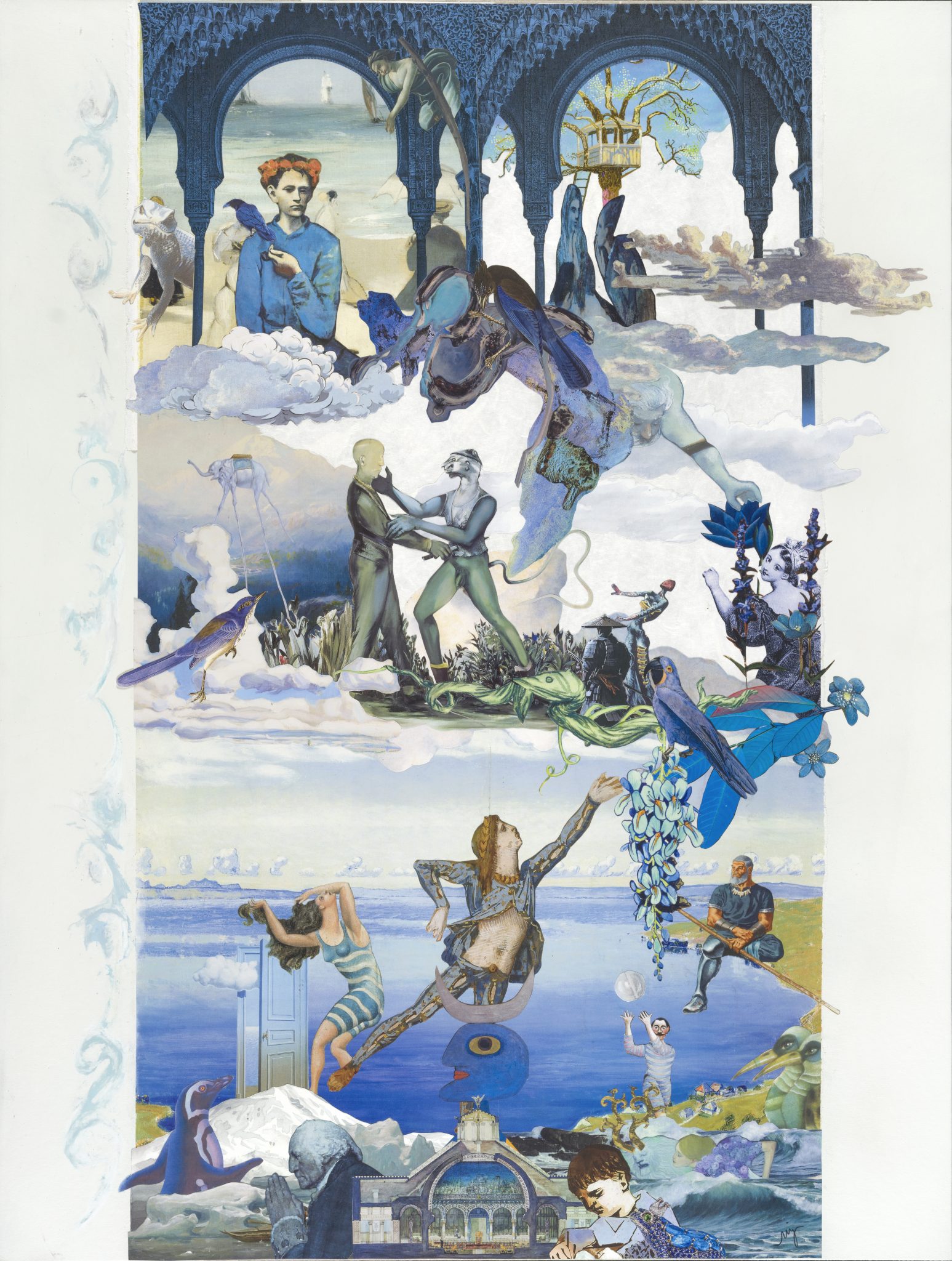 Dans la partie inférieure, un plan architectural rappelle celui du premier portrait. Cette fois, il est coloré et foisonne de vie. Il évoque un édifice religieux, impression renforcée par la présence de trois figures qui peuvent symboliser le Père, le Fils et le Saint-Esprit. Le triangle formé par ces figures renvoie aussi à l’unité parfaite du schéma thèse–antithèse–synthèse. Cette forme triangulaire se retrouve ailleurs dans le tableau, notamment dans la disposition des trois oiseaux bleus centraux et dans les bras tendus des personnages, symboles d’un équilibre atteint.