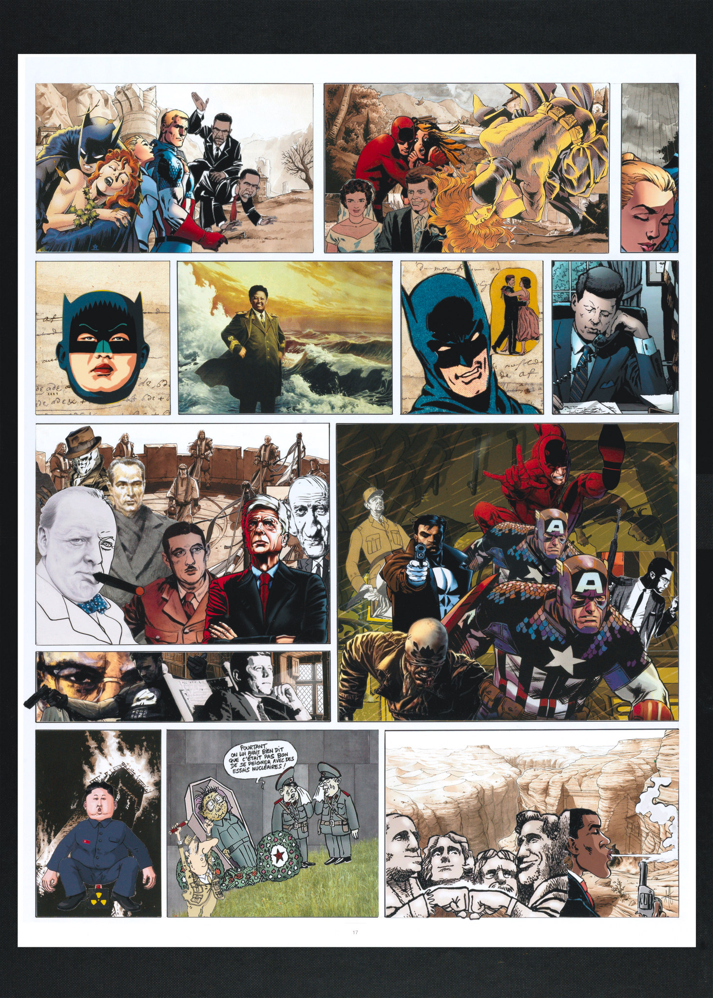 Le tableau se présente comme une page de comics. Dans les trois premières vignettes, les personnages principaux profitent d’un moment de légèreté. Puis surgit le « vilain » : Kim Jong Un. D’abord masqué, il révèle peu à peu ses ambitions démesurées.